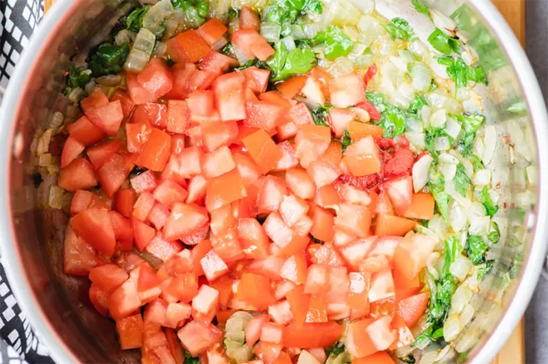 - 1 đến 1/2 cốc cùa chua tươi thái nhỏ hoặc 1 hộp cà chua nguyên quả hoặc nghiền nát cùng với nước ép của chúng.