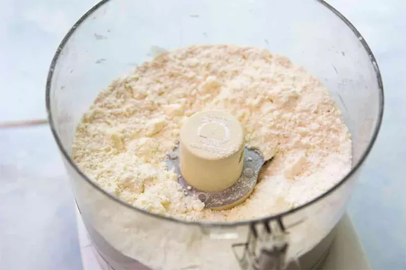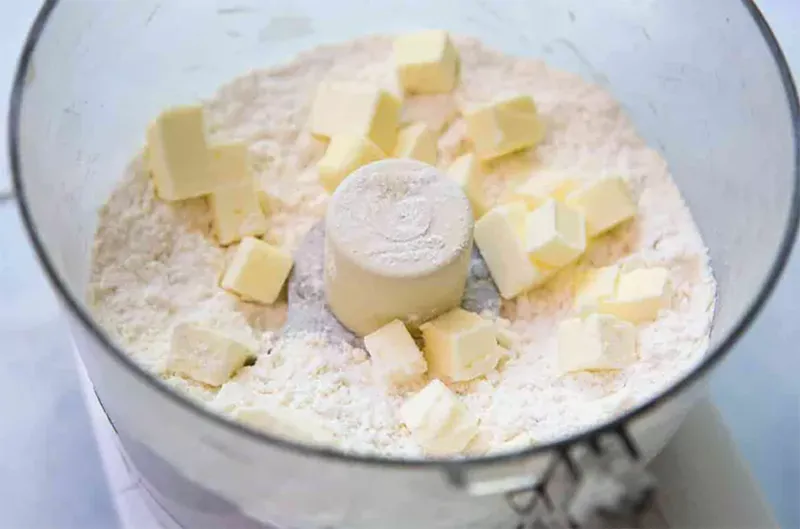 Bước 2: Thêm bơ. Cho một nửa số bơ vào, nhấn máy 8 lần. Cho nốt phần bơ còn lại, nhấn thêm 6 lần -> Lúc này hỗn hợp sẽ giống bột thô, còn nhiều vụn bơ cỡ hạt đậu – đây chính là yếu tố giúp vỏ bánh xốp giòn.