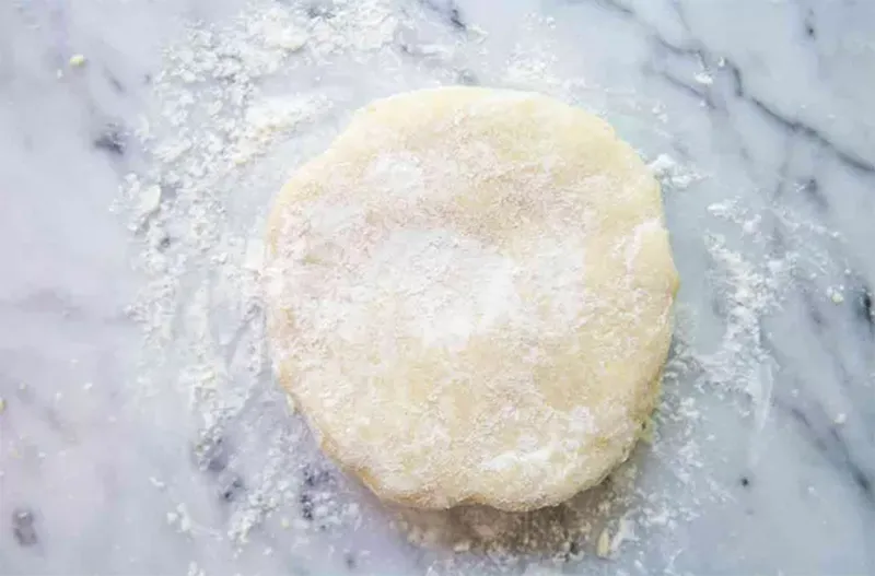 • Gom bột thành khối, ấn dẹt thành hình đĩa tròn, rắc ít bột mì lên mặt.