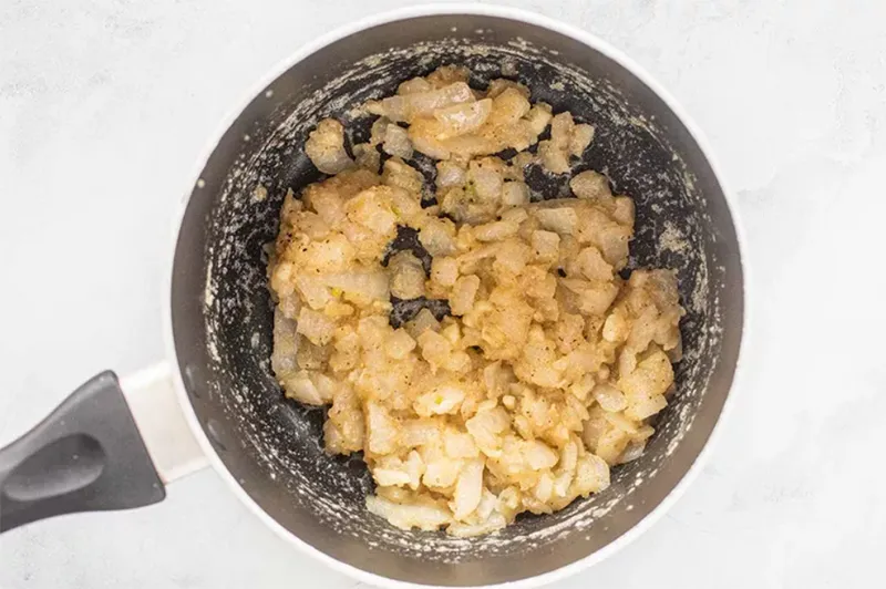 - Cho bột mì vào tạo roux, nấu 1–2 phút