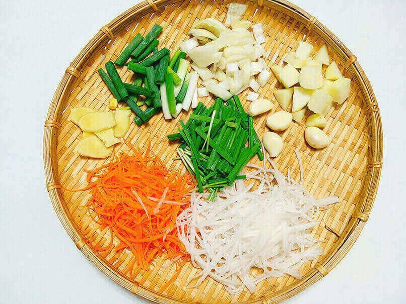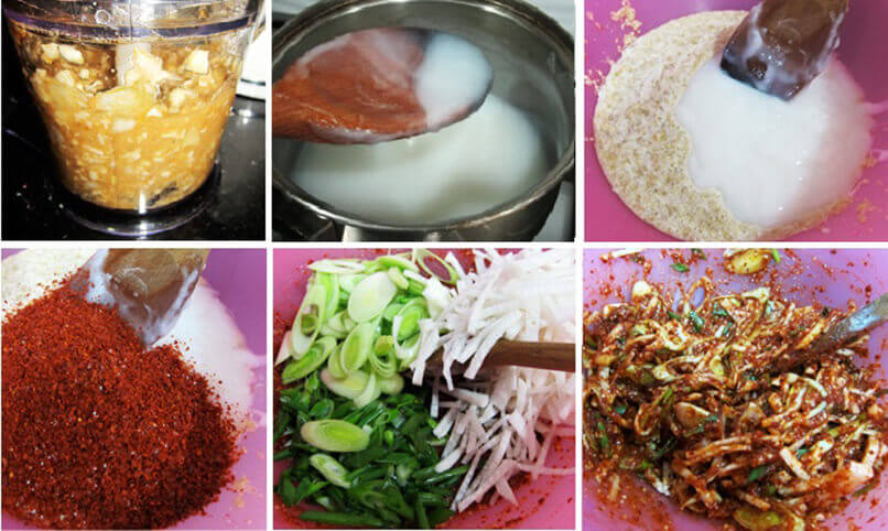 Thứ hai, đem các nguyên liệu đi sơ chế như cạo vỏ cà rốt rồi thái sợi. Rửa sạch và cắt khúc hành lá (từ 3-5 cm) sau đó trộn tất cả những nguyên liệu với muối để 3-4 tiếng. Rửa sạch củ gừng rồi cắt mỏng. Tỏi bóc vỏ. hành tây, táo, lê rồi xoay nhuyễn. Đem bột nếp đi nấu thành hỗn hợp sền sệt.