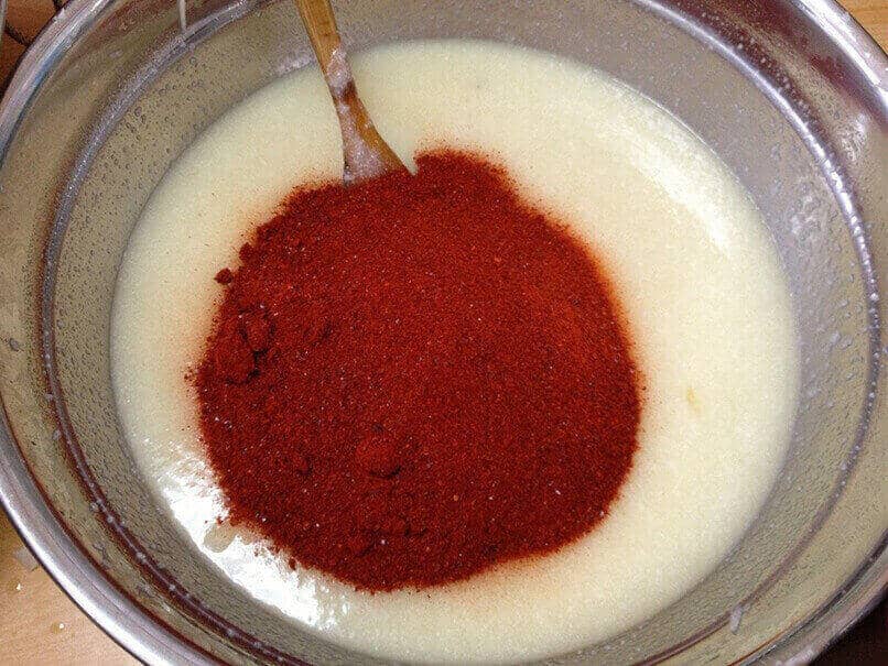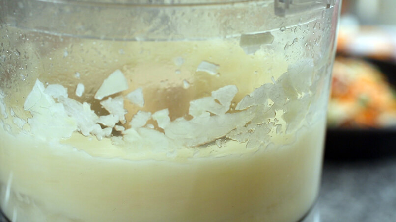 Thứ ba, làm nước sốt kim chi. Cho những nguyên liệu xoay nhuyễn như: hành tây, táo, lê, nước nắm, đường, giấm, ớt bột, ruốc, mì chính, hỗn hợp bột nếp, hành lá cắt khúc trộn đều.