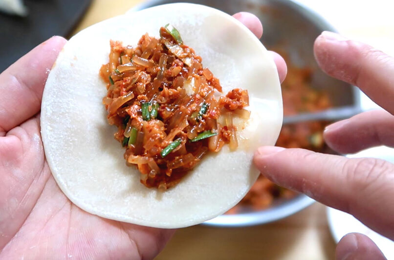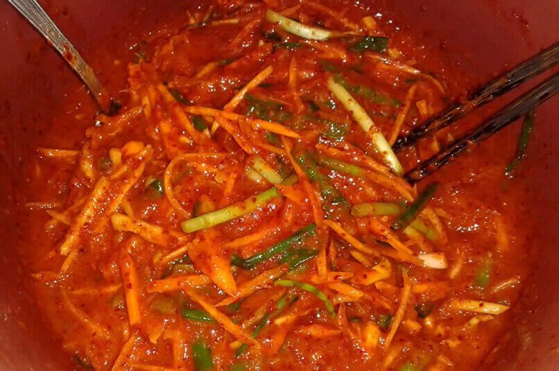 Thứ tư, đem kim chi và cà rôt đã sát muối đi rửa sạch với nước. Vắt khô nguyên liệu rồi phết hỗn hợp sốt. Đổ cả hành cắt khúc và cà rốt vào hỗn hợp sốt kim chi và trộn đều.